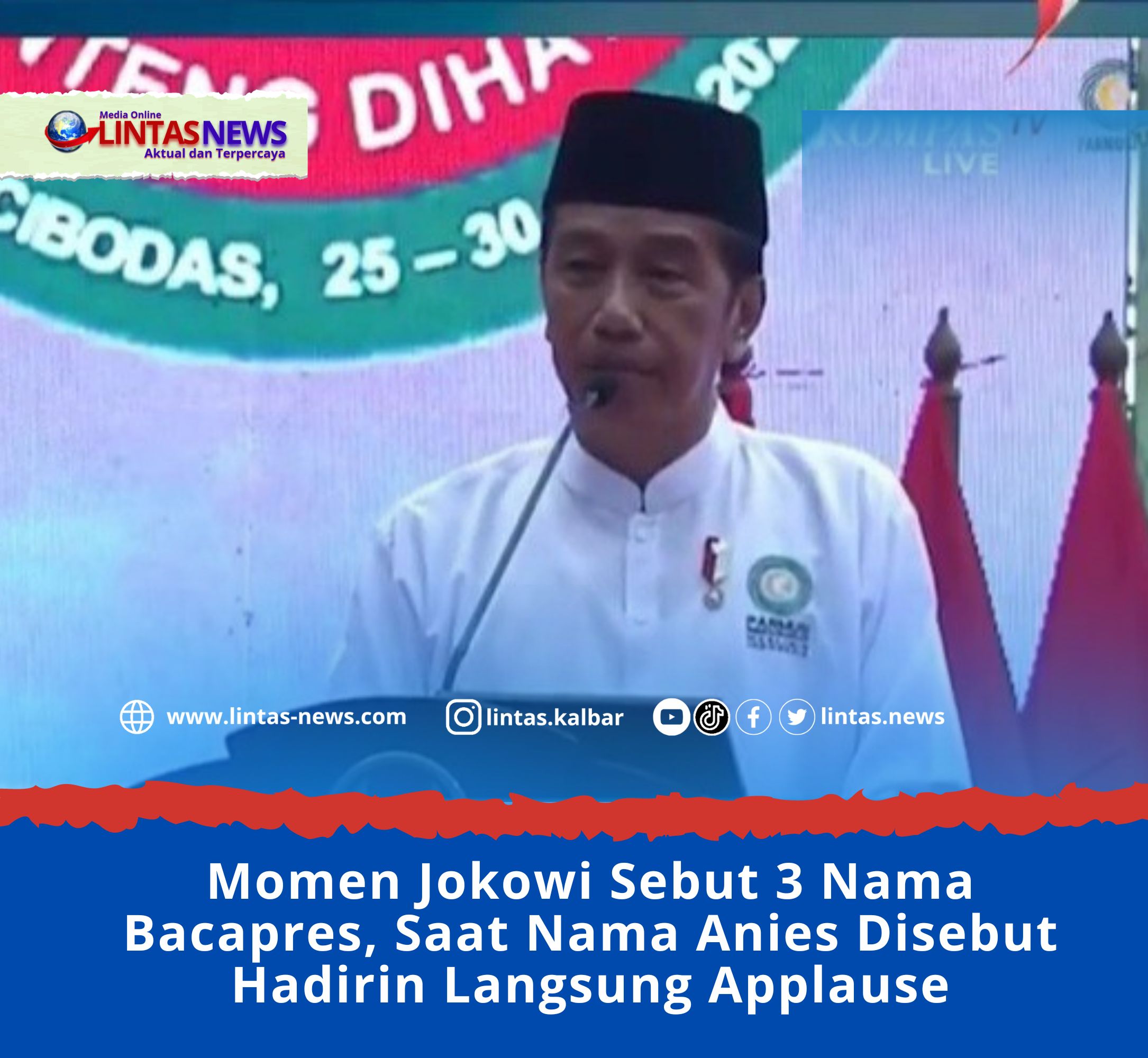 LINTAS.NEWS, JAKARTA – Presiden Joko Widodo (Jokowi) menyampaikan kebebasan dalam menentukan pilihan politiknya di pilpres 2024. Masyarakat, bebas memilih bakal calon presiden ada tiga nama Prabowo Subianto, Anies Baswedan, ataupun Ganjar Pranowo. Namun saat sebut nama Anies Baswedan peserta Jambore Nasional Da’i Desa Madani Parpoli langsung berikan applause dengan semangat.