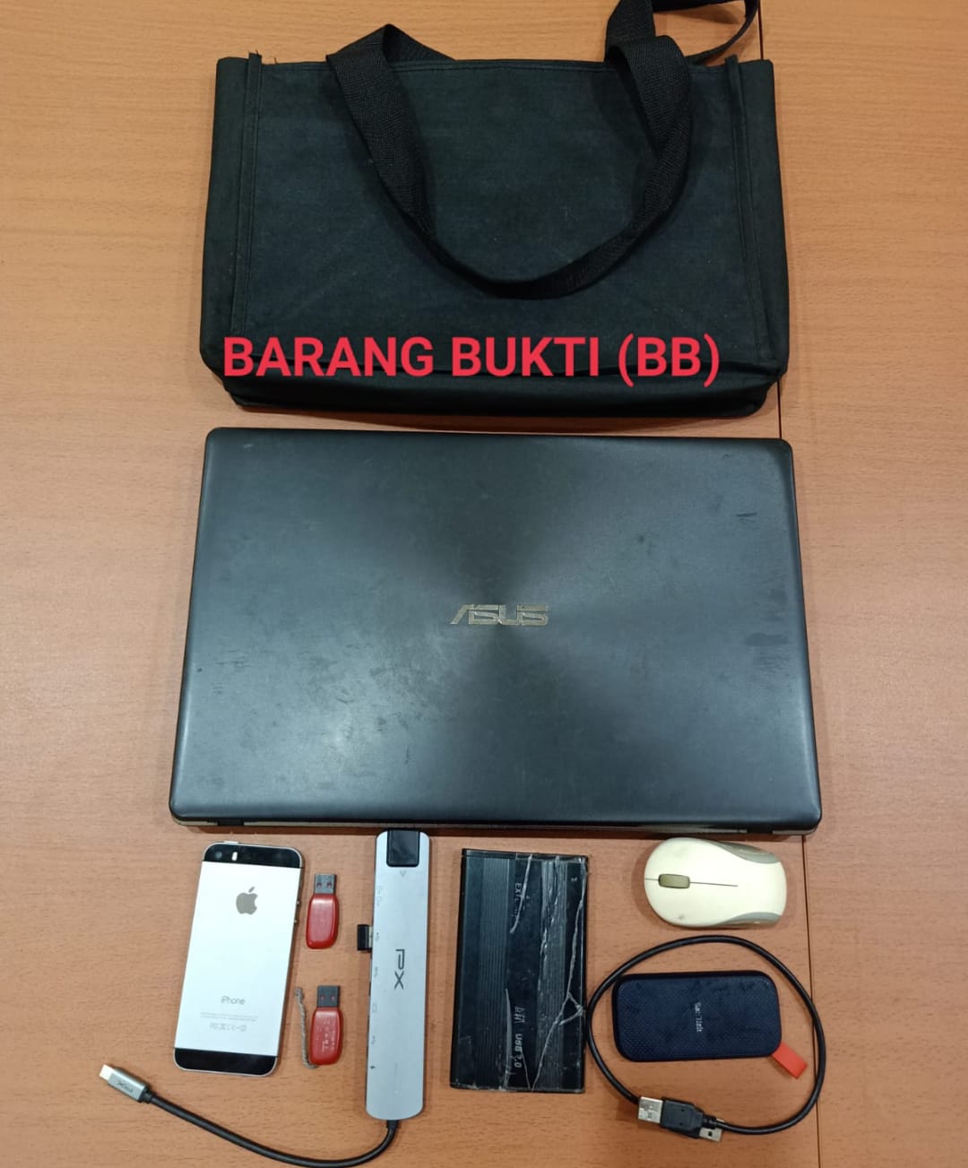 Dari diduga pelaku JLK (18) dan FR (16) telah diamankan barang bukti berupa 1 (satu) unit Laptop merek/type Asus X550Z, 1 (satu ) unit digital flash Dish USB-SSD, 1 (satu) unit digital Hard Disk USB 500 GB, 1 (satu) unit digiyal Flash Disk USB-Dongle px USB merk/type C3.1 hub Converter accesoris laptop, 1 (satu ) unit digital Flash Disk USB 16 GB dan 2 (dua ) unit Sandisk, 1 (satu ) unit Hand Phone merk/type iphone 5S dan 1 (satu) tas warna hitam.