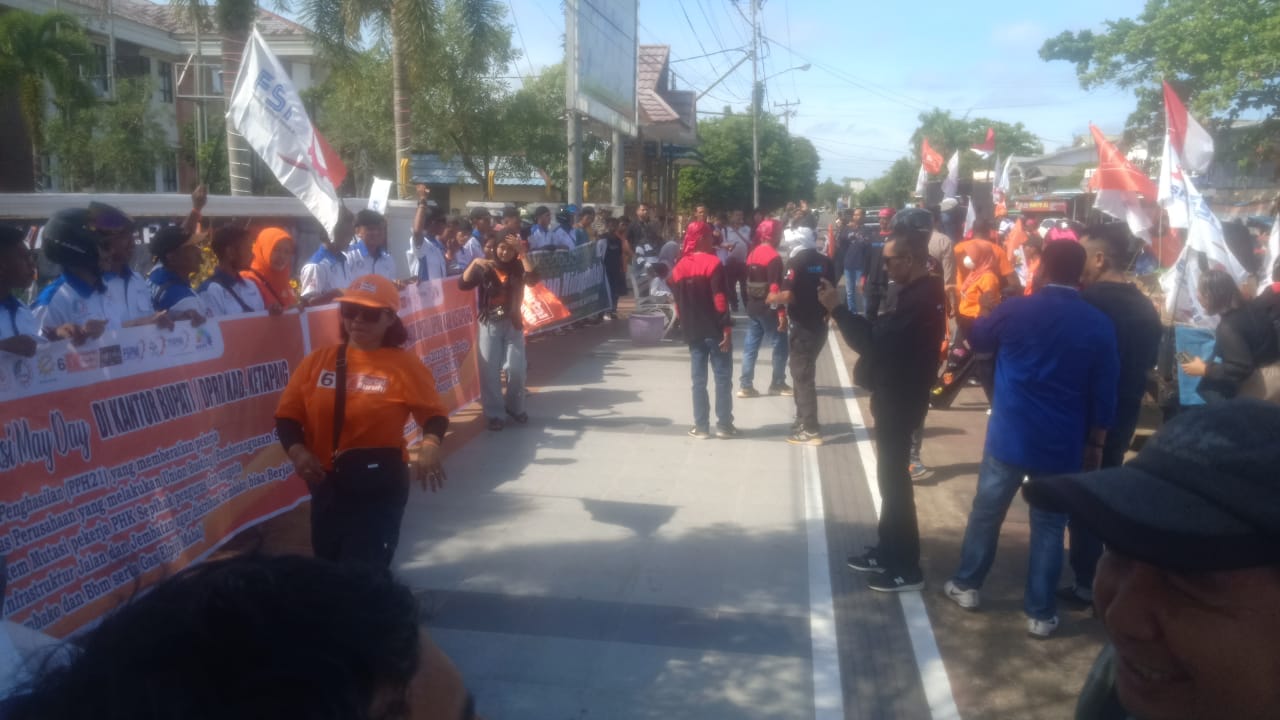 LINTAS NEWS, KETAPANG – Polres Ketapang Polda Kalbar menurunkan 120 personel untuk mengamankan kegiatan penyampaian aspirasi dari ratusan buruh pekerja yang tergabung didalam Federasi Serikat Pekerja Metal Indonesia (FSPMI) dan Serikat Buruh Seluruh Indonesia (SBSI) Kabupaten Ketapang. Ratusan buruh tersebut melaksanakan orasi untuk menyampaikan aspirasi mereka di depan Gedung DPRD dan Kantor Bupati Ketapang, pada rabu (01/05/2024) Pukul 09.00 Wib.