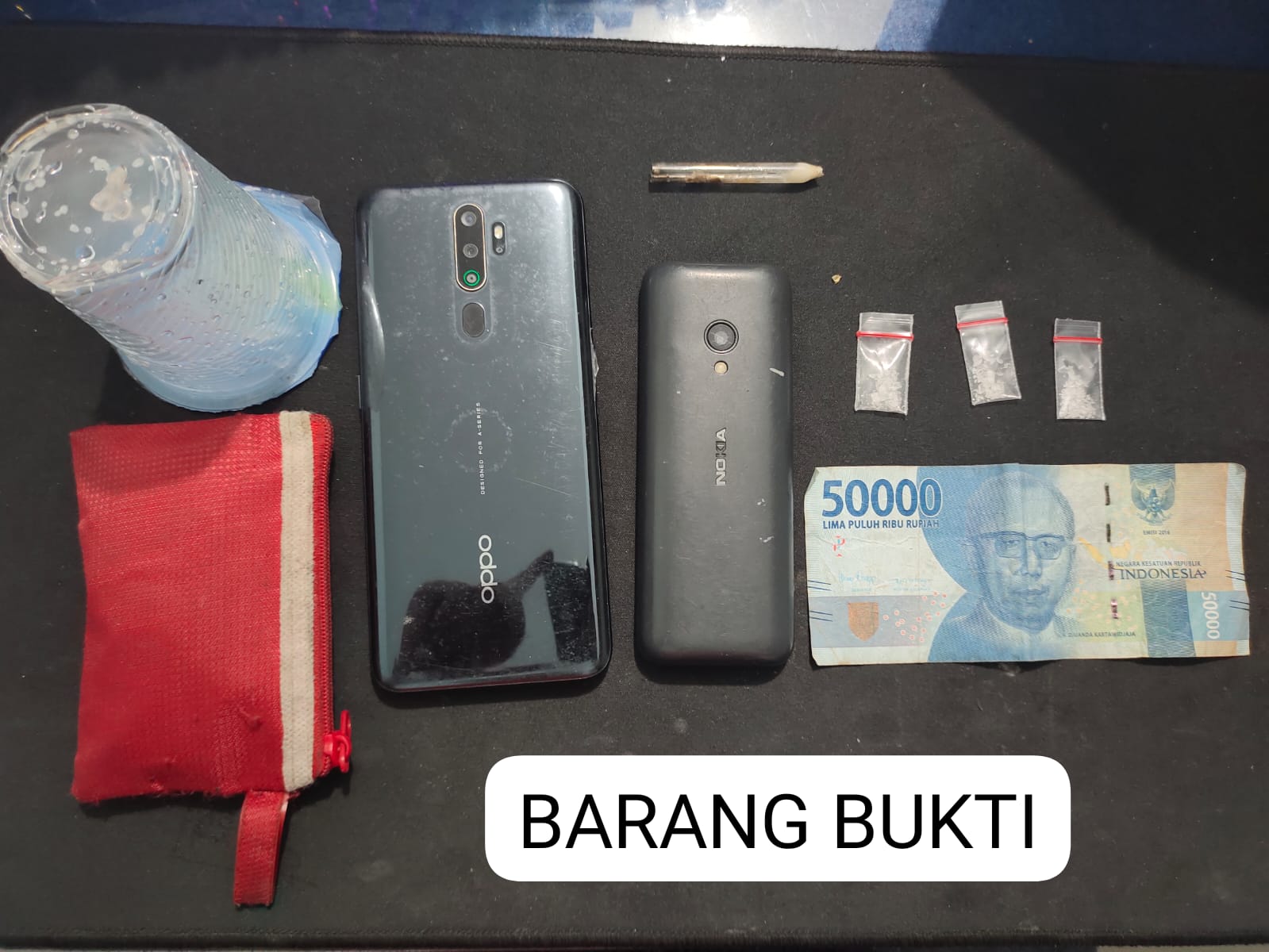 Kemudian saat dilakukan penggeledahan ditemukan barang bukti berupa 3 (tiga) Buah plastik klip berukuran kecil yang berisikan Narkotika Shabu brutto 0,51 gram, 1 (satu) pipa kaca / pirex bekas pakai brutto 1,31 Gram, 1 (satu) dompet kecil warna merah tempat menyimpan narkotika shabu, 1 (satu) buah alat hisap / bong terbuat dari gelas air mineral, 1 (satu) unit Handphone Android Merk Oppo Warna Hitam, 1 (satu) unit Handphone Merk Nokia Warna Hitam, dan Uang Tunai Rp. 50.000 (Lima Puluh Ribu Rupiah).