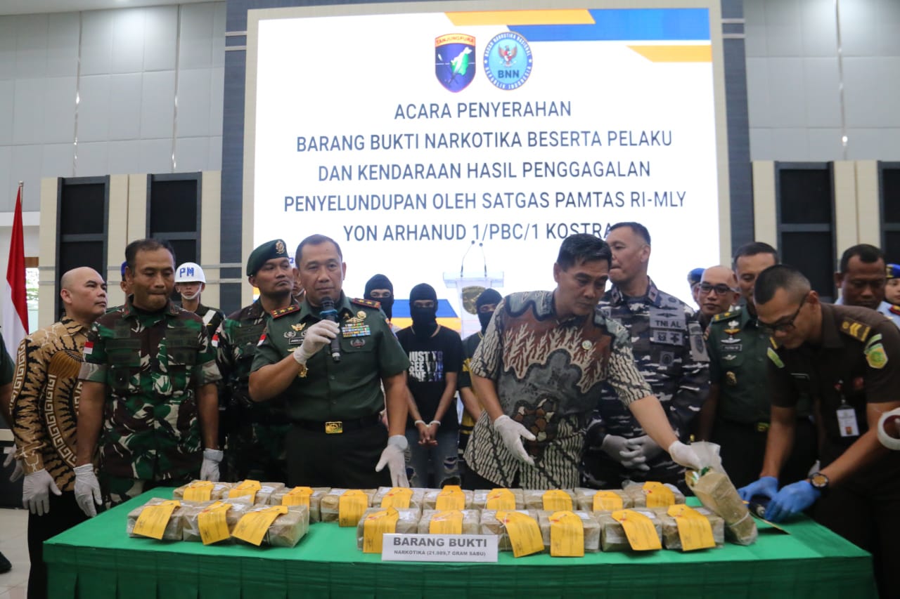 Dihadapan awak media, Pangdam XII/Tpr Mayjen TNI Jamallulael mengucapkan terimakasih kepada seluruh jajaran serta BNN, kepolisian, bea cukai, satgas Intel dari BIN, BAIS, Kodam dan Korem serta Satgas Teritorial atas keberhasilan pengungkapan kasus tersebut.