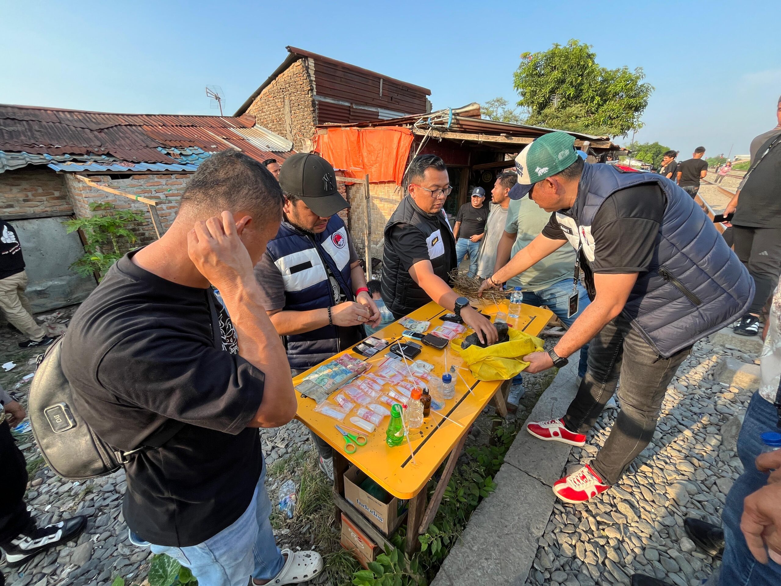 Dua titik sarang narkoba. di bantaran Rel KA Tembung yang jadi sasaran kali ini, Gang Nusa Indah, dan Gang Pisang, Desa Tembung, Kecamatan Percut Seituan. Sedangkan identitas 4 pria yang diduga pelaku narkoba yakni DS (40), AF (20), SH (37), dan ZS (48) keempatnya diringkus berikut barang bukti narkotika jenis sabu yang jumlahnya tidak sedikit.